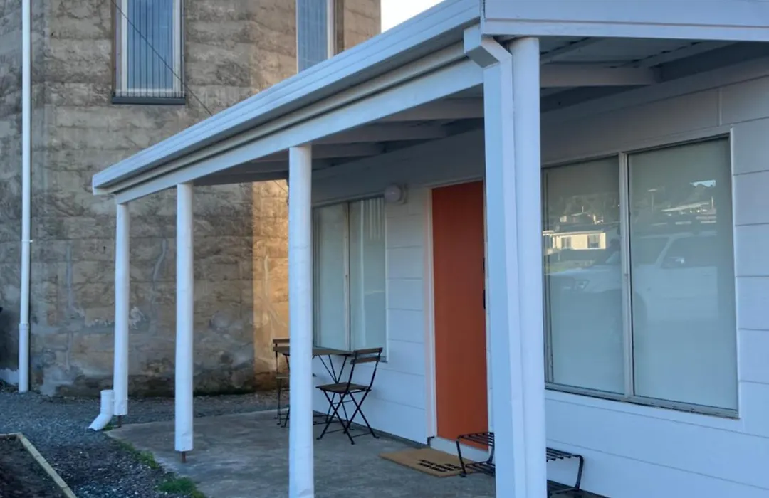 The Rectory Zeehan includes a dining place and an outdoor dining area with a microwave oven, an electric kettle, and a refrigerator.